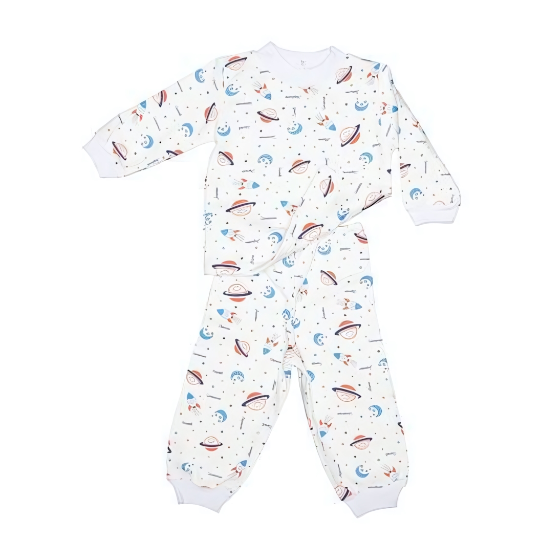Комплект состоит из светлой рубашки с длинным рукавом и свободных штанов с широкими манжетами. Идеально подходит для ночного отдыха и утренних подвижных игр дома.