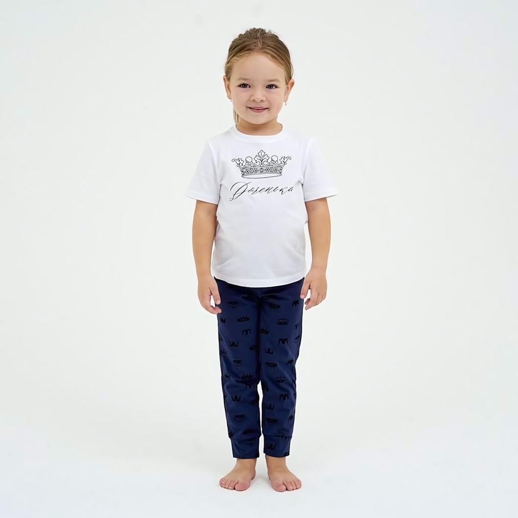 Пижама для девочки "Crown", белая футболка с короной и темно‑синие брюки, 100% хлопок, возраст 122‑128