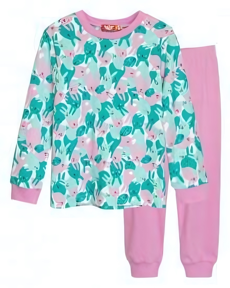 Комплект из футболки с длинным рукавом и классических брюк украшен милым принтом с зайчиками. Розовая гамма подойдёт для любого интерьера детской комнаты. Удобная длина брючин до щиколотки предотвращает спутывание во время сна.