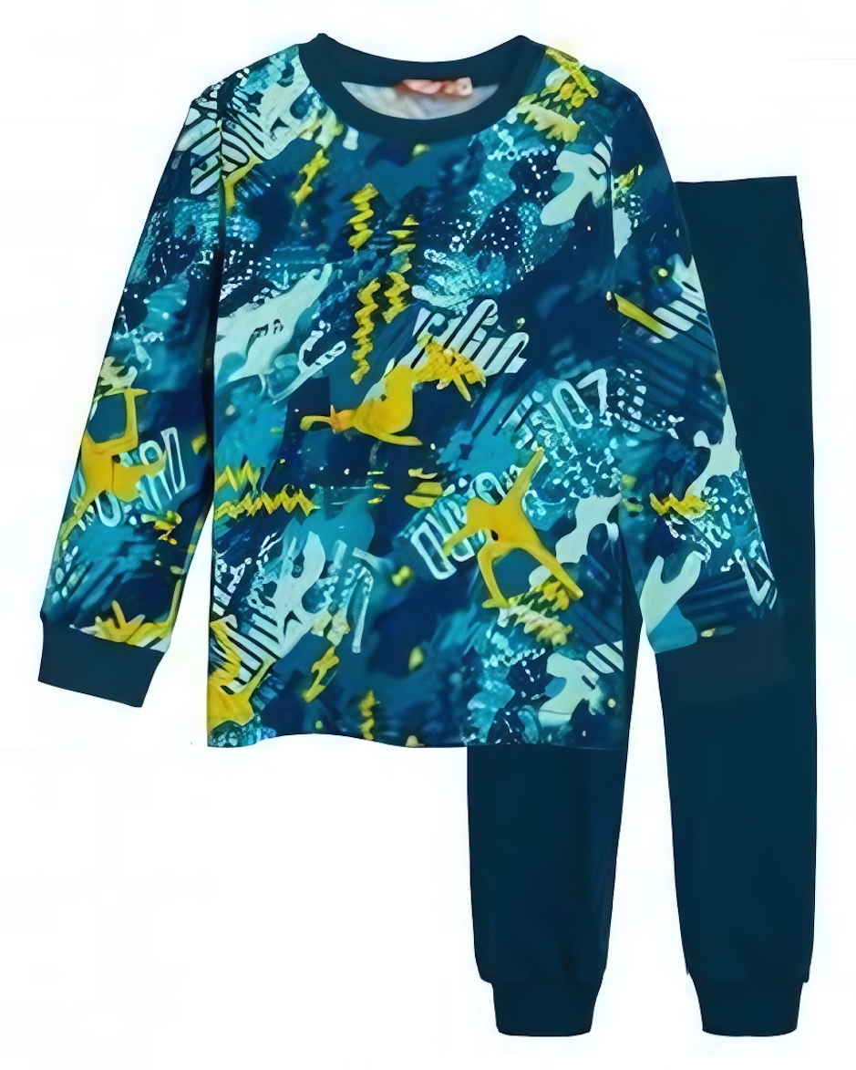 Пижама состоит из футболки с длинным рукавом и брюк. Футболка тёмно-синего цвета украшена ярким абстрактным узором в зеленых, жёлтых и белых тонах. Брюки прямого кроя выполнены в тёмно-синем цвете без принта.