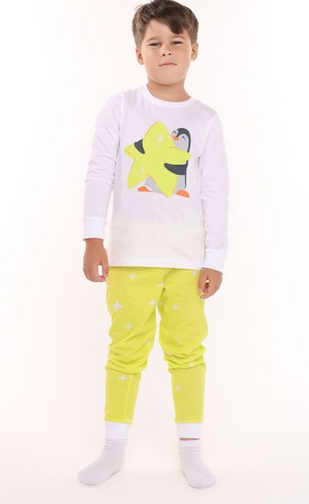 Верхняя часть выполнена в белом цвете с контрастным жёлтым декором, штанишки — насыщенного солнечного оттенка с россыпью звёздочек. Смешной пингвин на груди превратит вечерний ритуал в увлекательную игру.