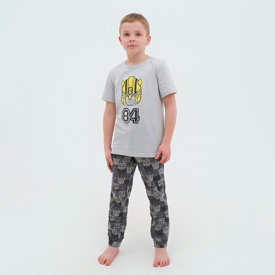 Футболка с изображением головы Бамблби и брюки с рисунком роботов создают неповторимый стиль, который понравится каждому маленькому фанату Трансформеров.