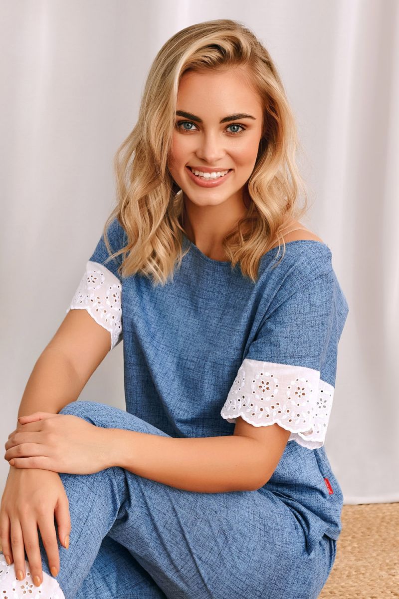 Пижама состоит из двух предметов: свободной футболки с короткими цельнокроеными рукавами и прямых брюк с поясом на широкой резинке. На спине футболки присутствует декоративная нашивка с текстом. Комплект представлен в насыщенном синем цвете, который отлично сочетается с белой кружевной отделкой.