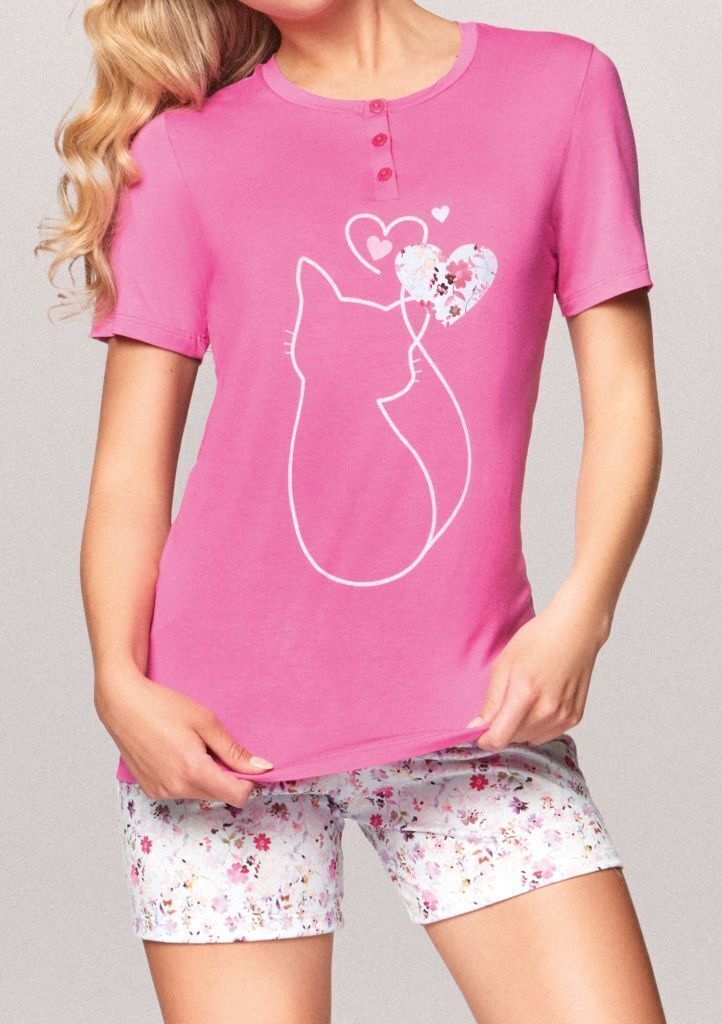 Пижама состоит из футболки с коротким рукавом и шорт, что делает её идеальной для теплых вечеров. Футболка украшена тремя пуговицами на планке и оригинальным рисунком в виде силуэта кошки и сердечек, что придаёт ей игривый вид. Шорты имеют эластичный пояс и цветочный принт, что добавляет легкости и свежести образу. Этот комплект отлично подходит для домашнего использования, а также для спокойного отдыха.