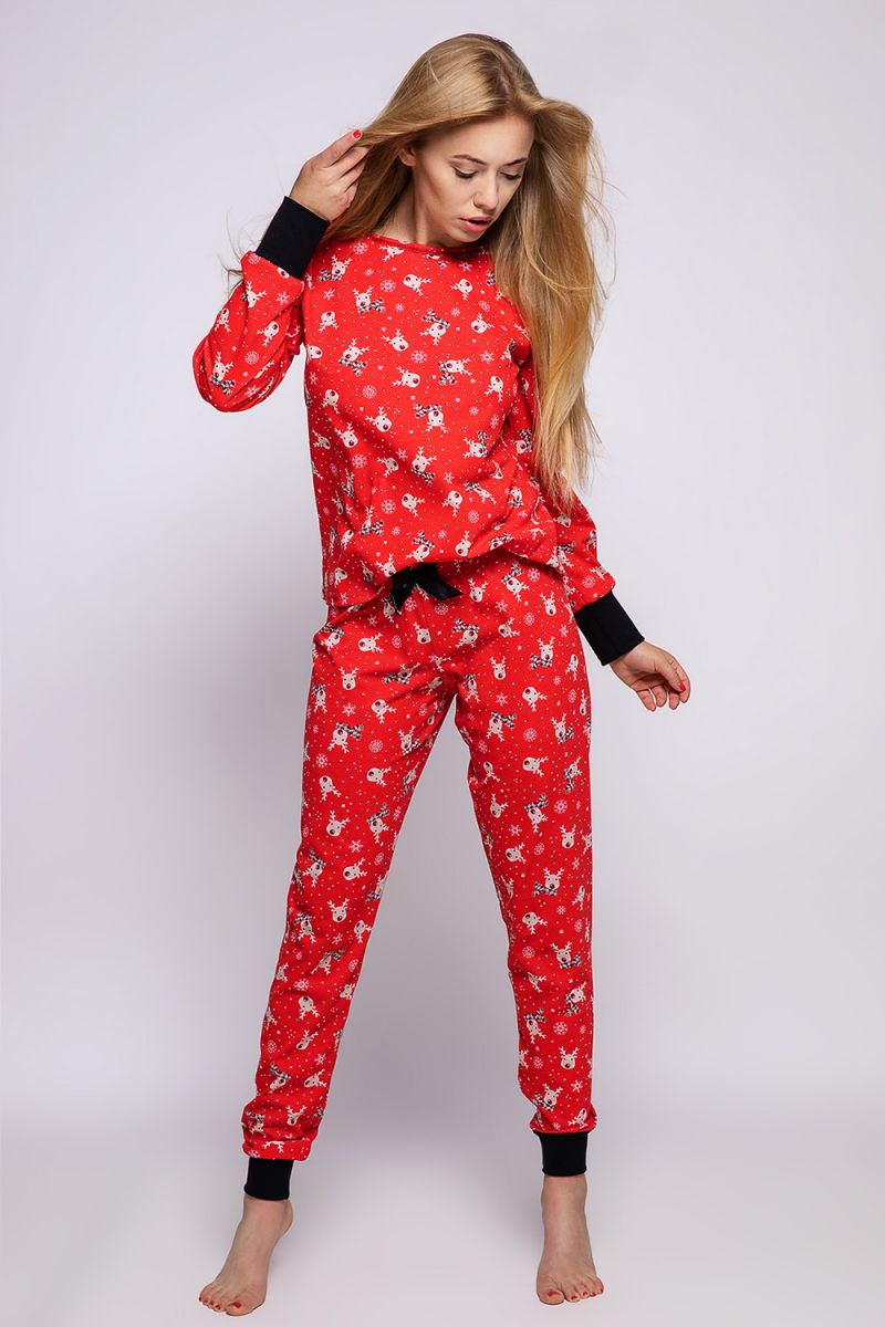 Вы получаете полный комплект пижамы: один лонгслив (кофта с длинными рукавами) и одни брюки. Цвет — насыщенный красный. Указанный размер — M.