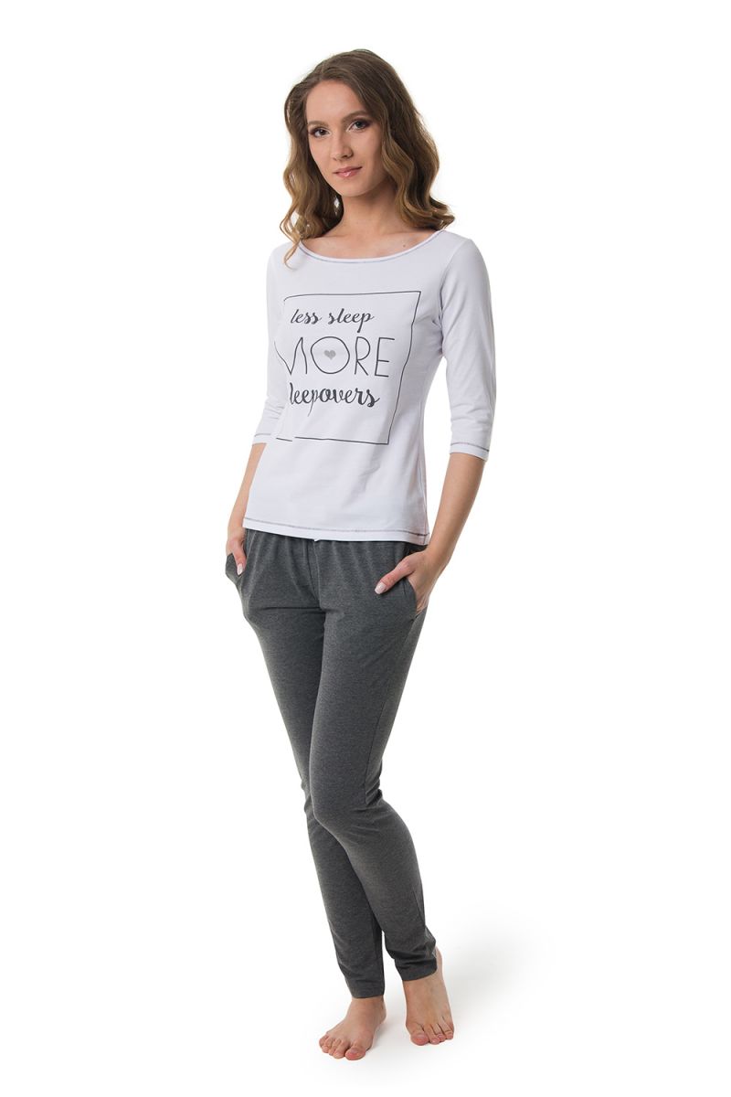 Пижама представлена в нежной двухцветной гамме — белый с серым, что создает спокойный и эстетичный вид. Размер M соответствует стандартной российской сетке. Рукав 3/4 — это не только модный тренд, но и практичное решение, обеспечивающее свободу рукам. Брюки с резинкой на поясе гарантируют идеальную посадку без давления.