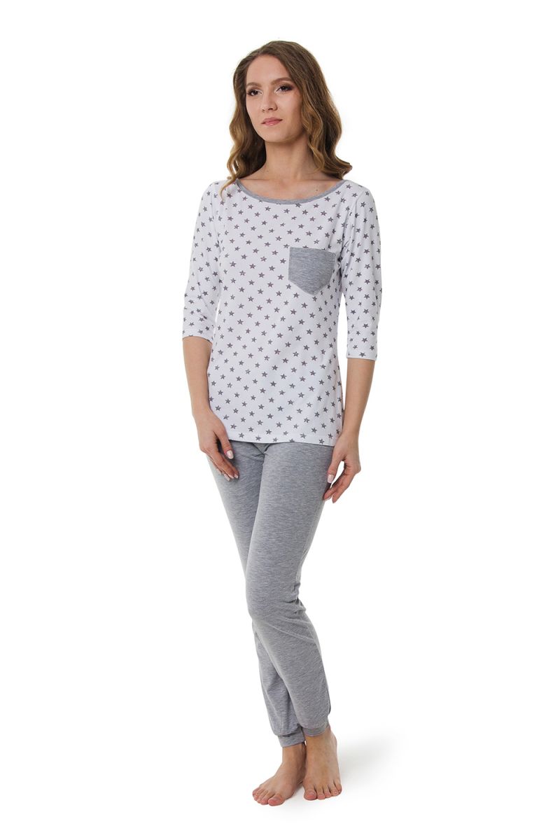 - Стильный дизайн: Принт в виде звезд на футболке делает пижаму не просто домашней одеждой, а модным элементом гардероба. Сочетание белого и серого цветов выглядит свежо и нейтрально.