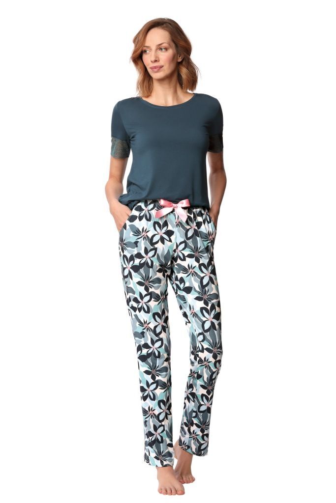 Пижама женская 'Zoya' с цветочным принтом, брюки с карманами, кружевные рукава, размер M, темно-бирюзовая