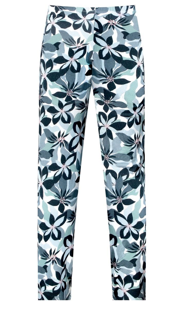 Пижама разработана с учётом анатомических особенностей: плоские швы не натирают кожу, а добавление эластана (8%) в состав гарантирует идеальную посадку по фигуре. Темно-бирюзовый оттенок топа гармонично сочетается с цветочным узором на брюках, создавая стильный контраст.