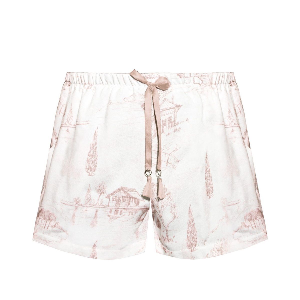 Комплект состоит из топа на тонких, регулируемых по длине бретелях и шорт с принтом на эластичной резинке. Топ имеет вытачки на груди, что обеспечивает идеальную посадку и поддержку. Шорты дополнены карманами, что делает их практичными для повседневного использования. Этот комплект идеально подходит для домашнего отдыха, сна или уютных вечеров.