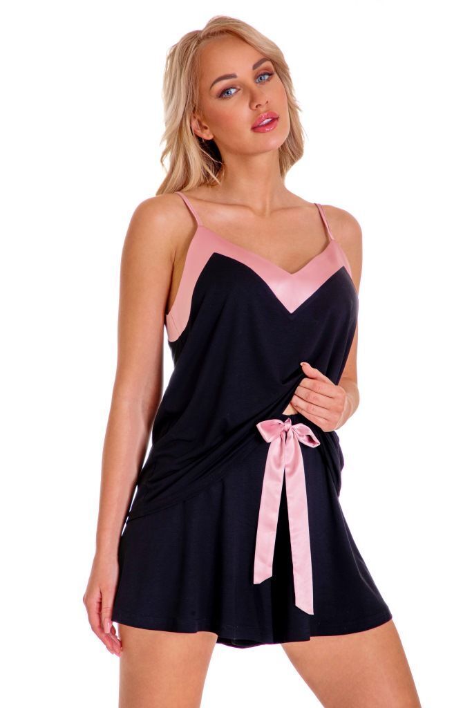 Комплект состоит из топа и шорт, изготовленных из гипоаллергенного материала (92% модал, 8% эластан). Чёрный базовый цвет сочетается с деликатными розовыми элементами, создавая сбалансированный дизайн. Свободный крой и длина до середины бедра обеспечивают максимальную свободу движений.