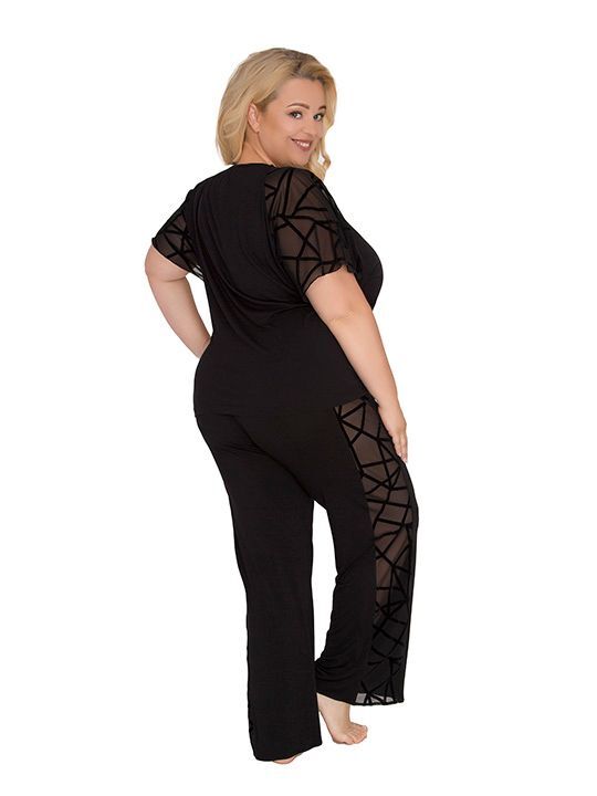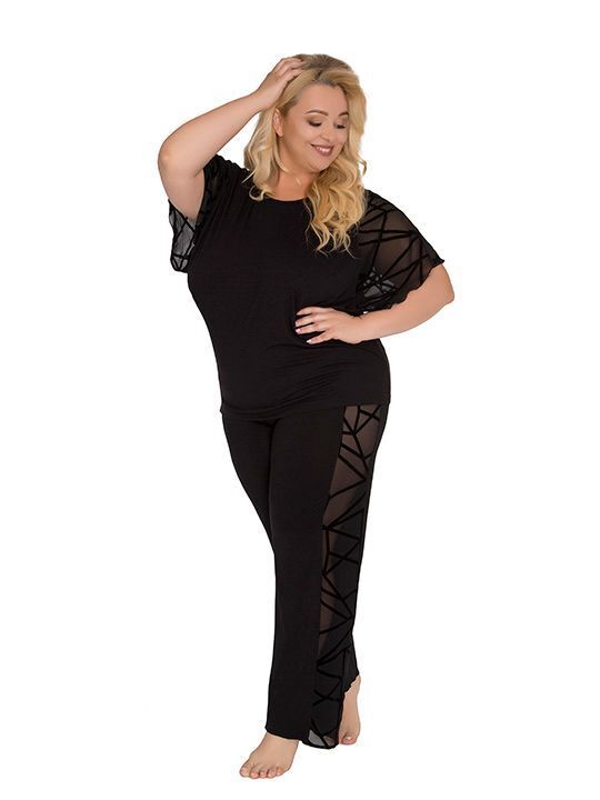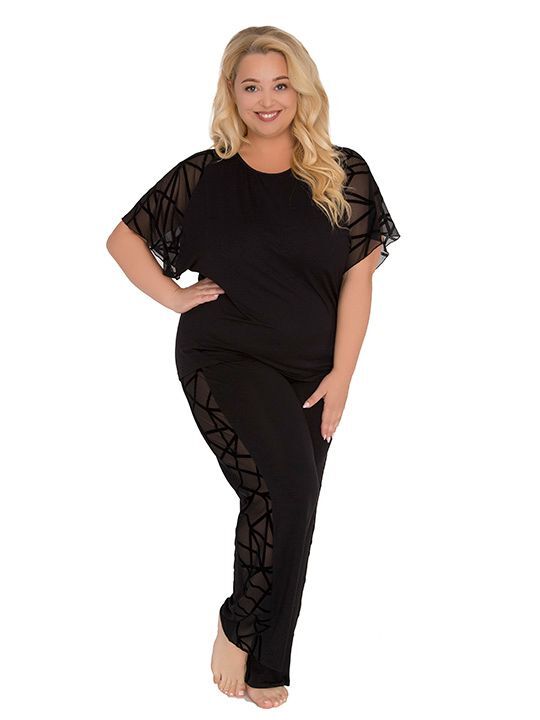 Комплект состоит из туники с круглым вырезом и свободных брюк, что обеспечивает максимальную свободу движений. Короткие рукава туники украшены полупрозрачными вставками из сетки с геометрическим рисунком, что добавляет изюминку в ваш образ. Брюки свободного кроя также имеют боковые вставки из сетки, что делает их стильными и современными. Этот комплект идеально подходит для домашнего использования, а также для спокойных вечеров с друзьями или семьей.