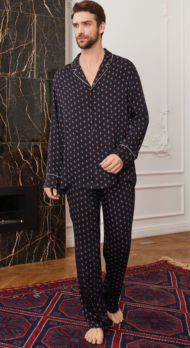 Пижамный жакет Laete создан для мужчин, которые ценят комфорт, аккуратный внешний вид и свободу движений даже дома. Темно-синий оттенок с аккуратным принтом в виде ромбов смотрится сдержанно и элегантно, а мягкая ткань приятно ощущается на коже, помогая расслабиться после насыщенного дня.