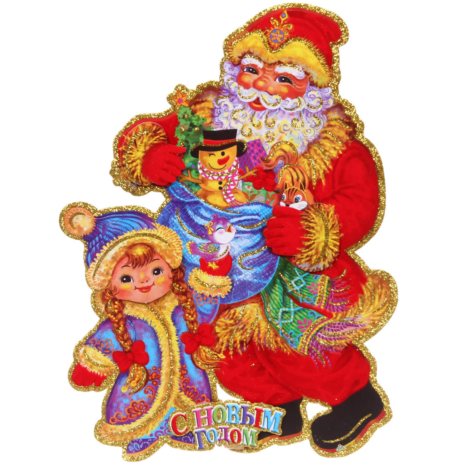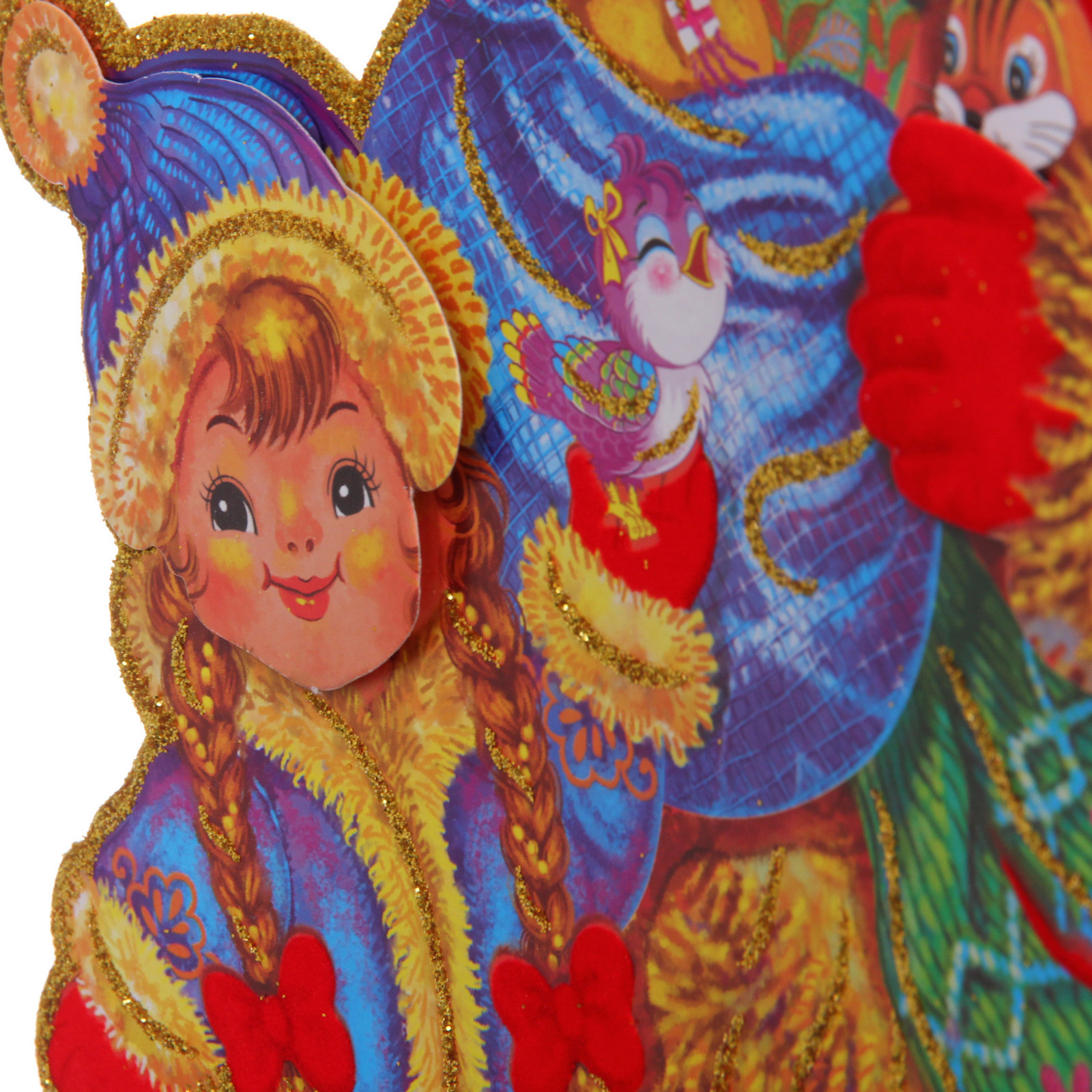 Плакат выполнен из качественной бумаги, что обеспечивает его долговечность и яркость цветов. Яркие детали, такие как Дед Мороз в красном костюме и девочка в синем зимнем наряде, привлекают внимание и создают позитивное настроение. Он станет отличным фоном для новогодних фотографий и веселых моментов с близкими.