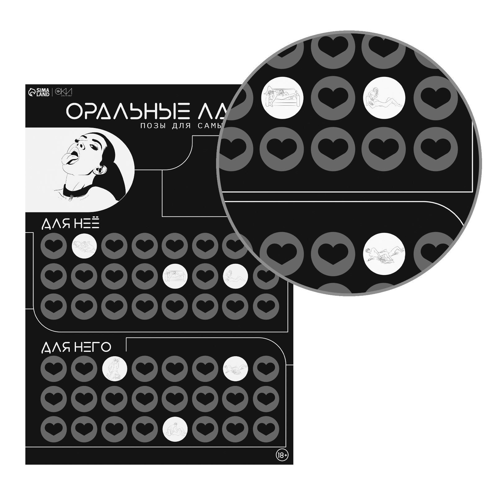 Чёрный скретч-плакат «Оральные ласки» — это 72 проверенные идеи для того, чтобы внести разнообразие в интимную жизнь пары. Каждая клеточка скрывает чувственную позу: 36 вариантов «для неё» и 36 «для него». Сотрите защитный слой серебряной монеткой — и получите яркое напоминание о том, что сегодня стоит попробовать.
