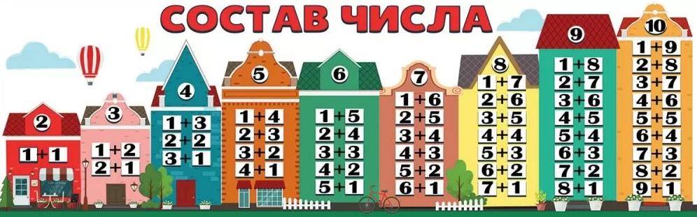 Обучающий плакат «Состав числа» с цветными домиками, числа 1-10, для детей 5-7 лет