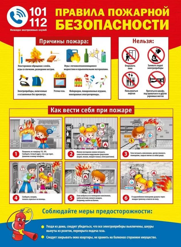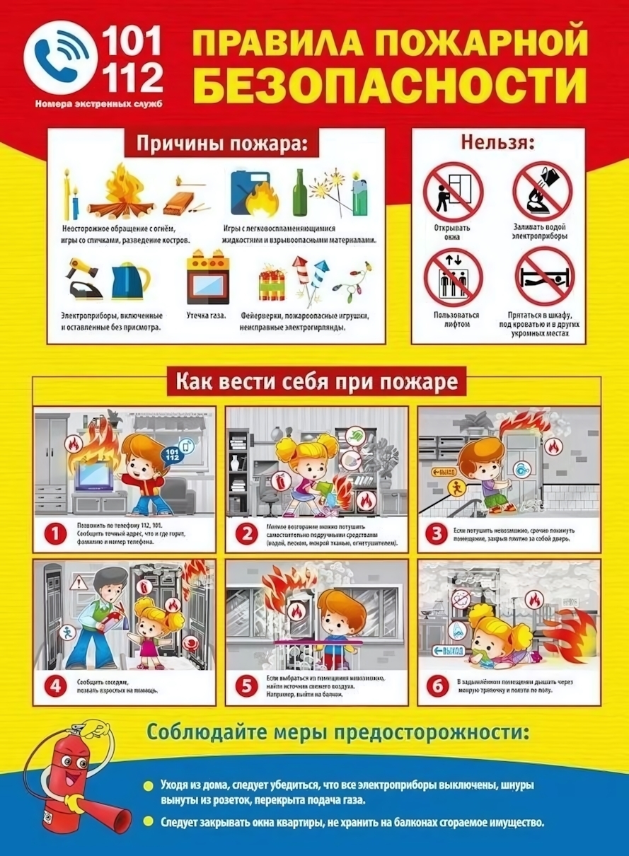 Почему стоит выбрать именно этот плакат? Во-первых, он содержит детализированные изображения и текстовые инструкции, которые помогут вам понять, как действовать в случае пожара. Во-вторых, плакат включает номера экстренных служб (101, 112) и рекомендации по предосторожности, что делает его незаменимым в любой ситуации. Яркие цвета (красный и желтый) привлекают внимание и подчеркивают важность информации.