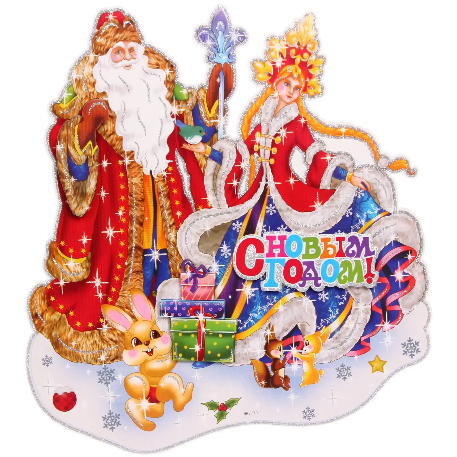 Плакат выполнен из качественной бумаги, что обеспечивает его долговечность и яркость цветов. Яркие изображения Деда Мороза и Снегурочки, а также надпись «С Новым Годом!» создают праздничное настроение и привлекают внимание. Благодаря своему размеру в 53 см, плакат легко разместить в любом интерьере, а его стильный дизайн подойдет как для домашнего, так и для офисного использования.