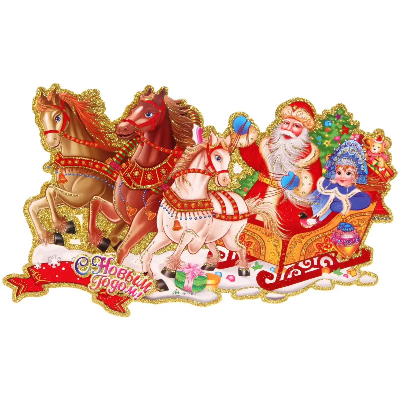 Яркий плакат с традиционными новогодними персонажами — идеальное решение для украшения дома, офиса или учебного заведения. Дед Мороз в красном кафтане, Снегурочка в голубом наряде и тройка празднично украшенных лошадей создают настроение зимней сказки.