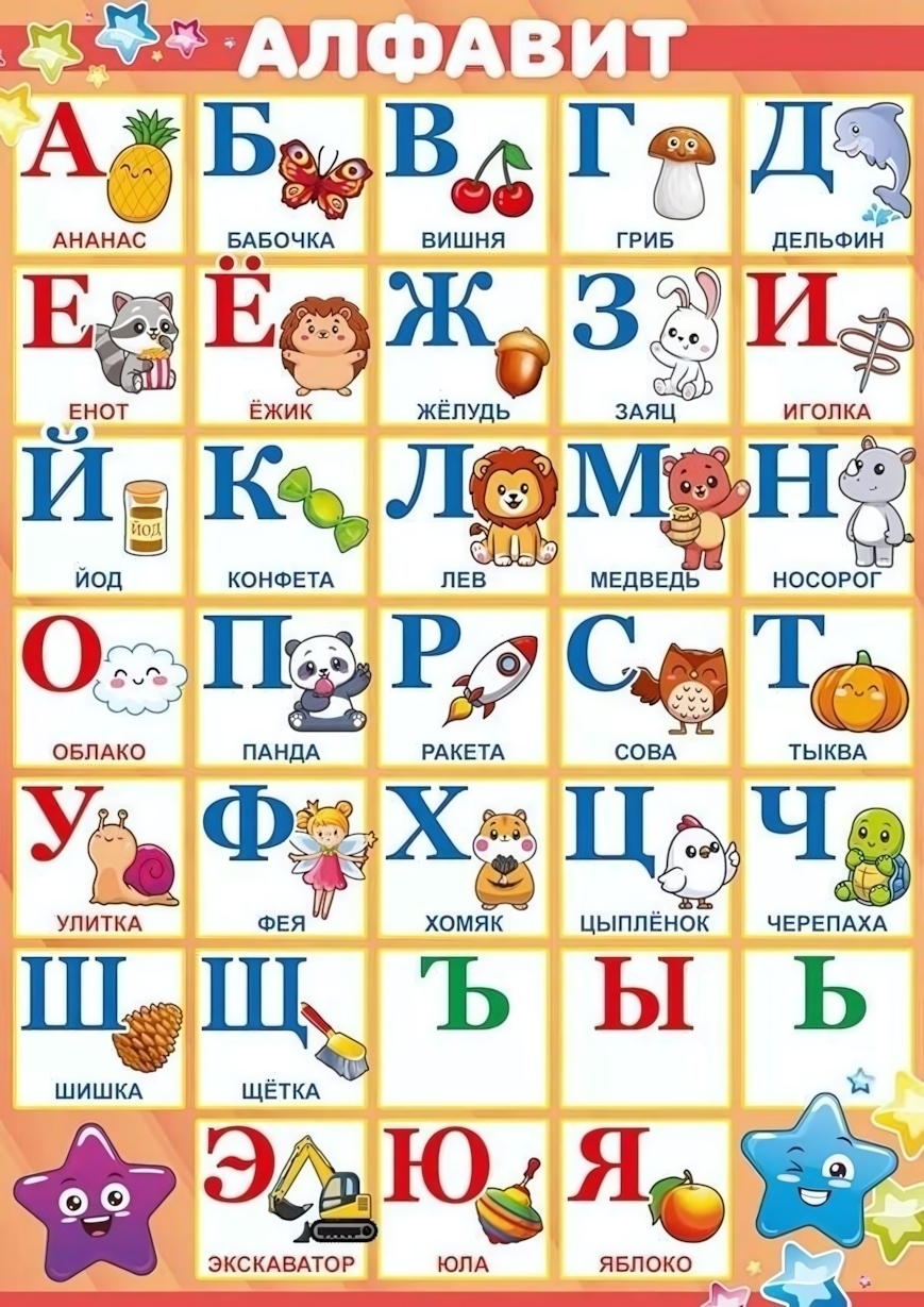 Плакат-шпаргалка «Алфавит» превратит изучение букв в увлекательную игру! Каждая из 33 ячеек содержит крупную синюю букву с красочной иллюстрацией-ассоциацией: от «А» с арбузом до «Я» с яркой звездой.