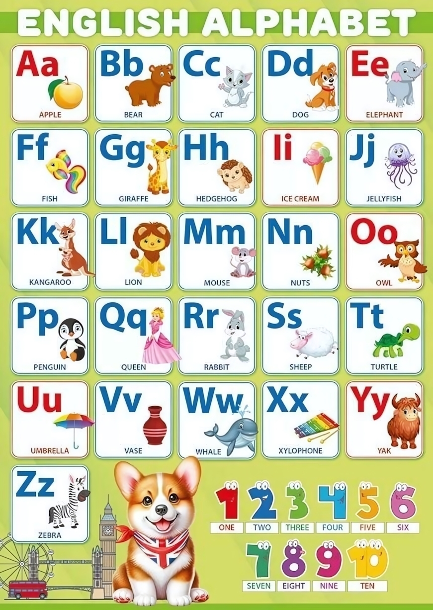 Этот яркий и красочный плакат-шпаргалка поможет детям легко запомнить английский алфавит и цифры от 1 до 10. Он идеально подходит для домашних занятий, детских садов и школ, стимулируя интерес к изучению языка через яркие иллюстрации животных и предметов, начинающихся на каждую букву.