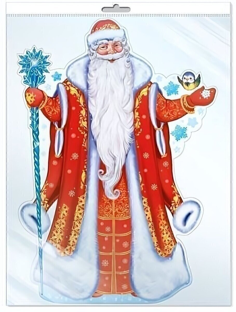 Создайте праздничную атмосферу всего за несколько минут с вырубным плакатом А2, выполненным с изображением Деда Мороза в ярком красном халате с золотыми узорами и белым мехом. Благодаря применению уф-лака детали рисунка приобретают выразительный блеск, что делает декор более эффектным и заметным.