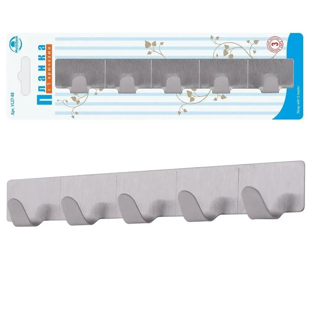 Планка настенная с 5 крючками «VL27-88», металл, самоклеющаяся основа 20 см для компактного хранения