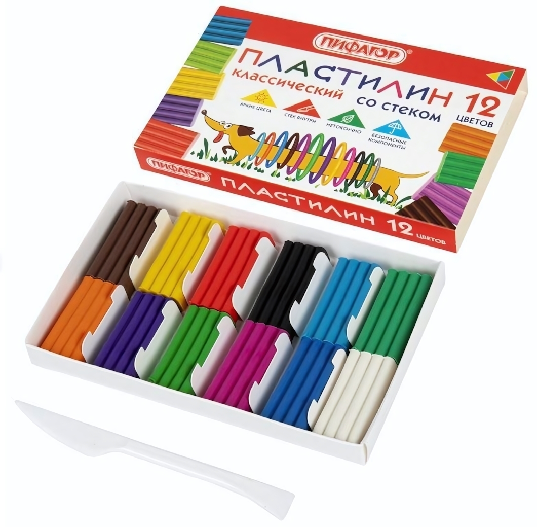 Этот набор пластилина состоит из 12 насыщенных цветов, включая белый, черный, синий, красный, зеленый, желтый, оранжевый, светло-зеленый, коричневый, голубой, фиолетовый и лиловый. Пластилин легко смешивается, что позволяет создавать новые оттенки и уникальные поделки. В комплекте также идет пластиковый стек, который поможет ребенку разделять пластилин на части или наносить орнамент на свои творения.