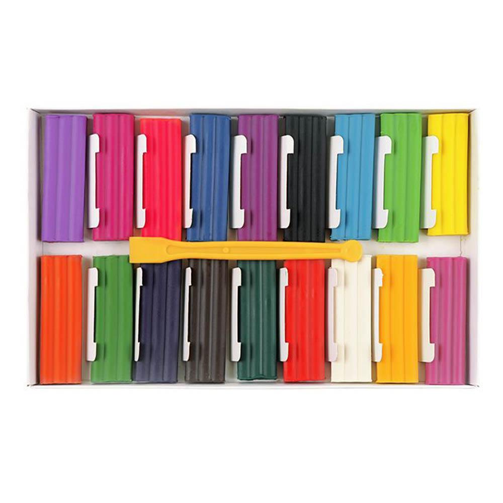 В упаковке представлено 18 прямоугольных брусков общей массой 270 г. Каждый цвет удобно отделяется и используется по мере необходимости. В комплект входит стек для моделирования, который помогает создавать четкие линии и аккуратные формы.