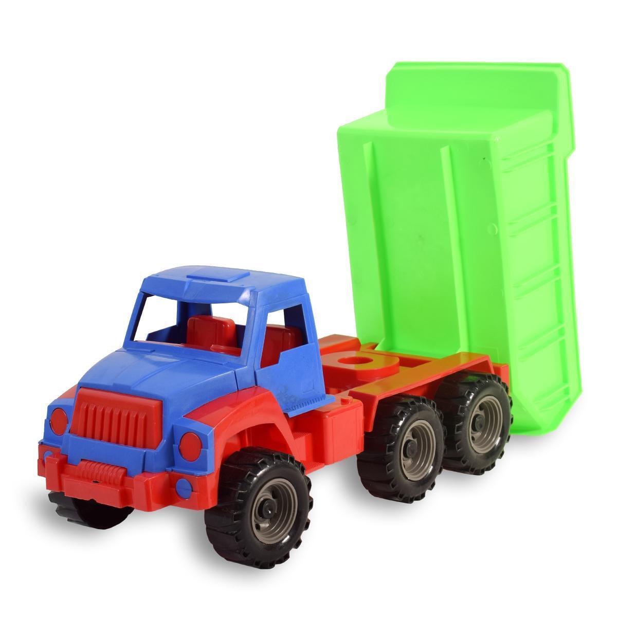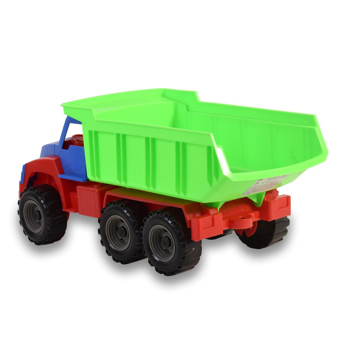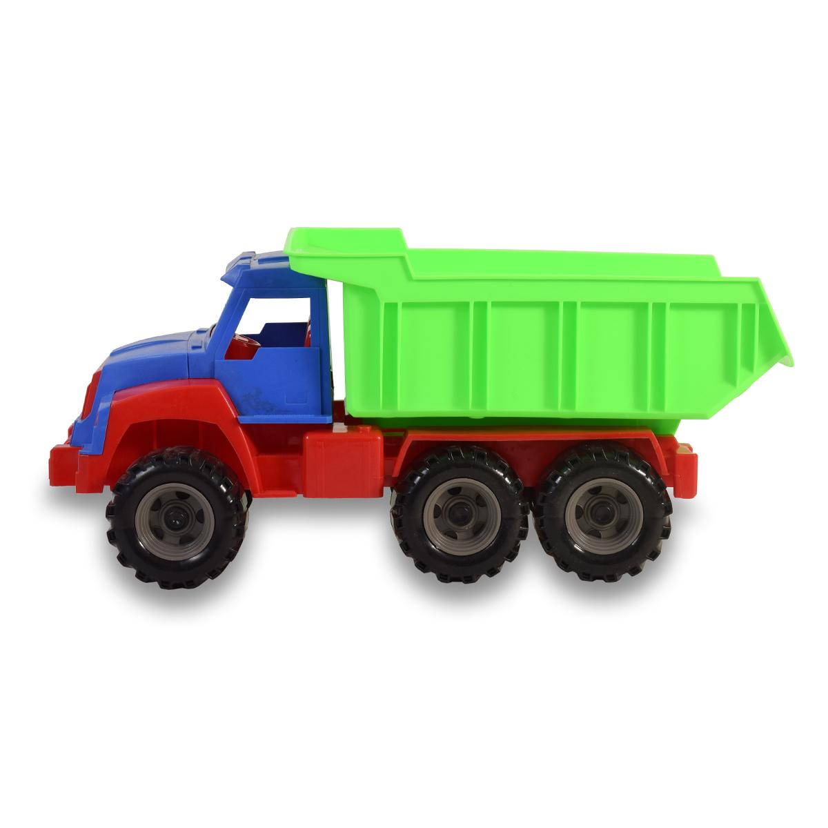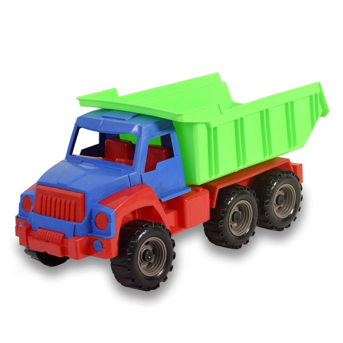 Размеры игрушечной машины составляют 43х18х20 см, что делает её удобной для детских рук. Кузов самосвала может подниматься, что добавляет элемент интерактивности в игру. Игрушка доступна в ярких цветах: красном, синем и зеленом, что делает её привлекательной для детей.