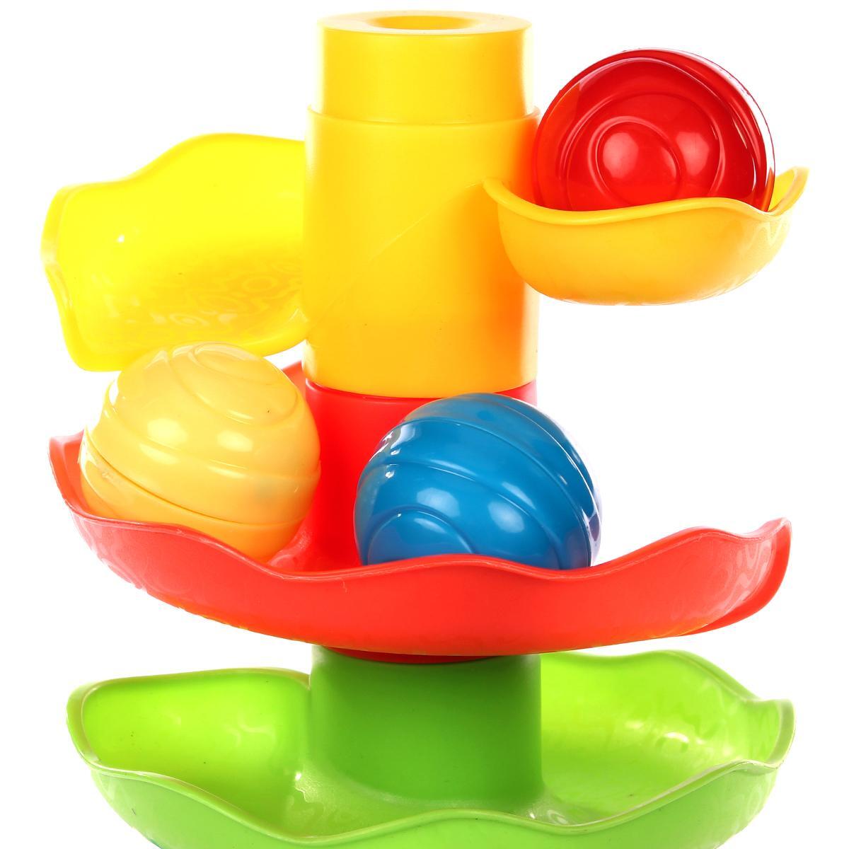 Простая механика игры: ребенок бросает шарики в верхнюю часть конструкции и наблюдает за их движением по спирали вниз. Это развивает причинно-следственные связи.