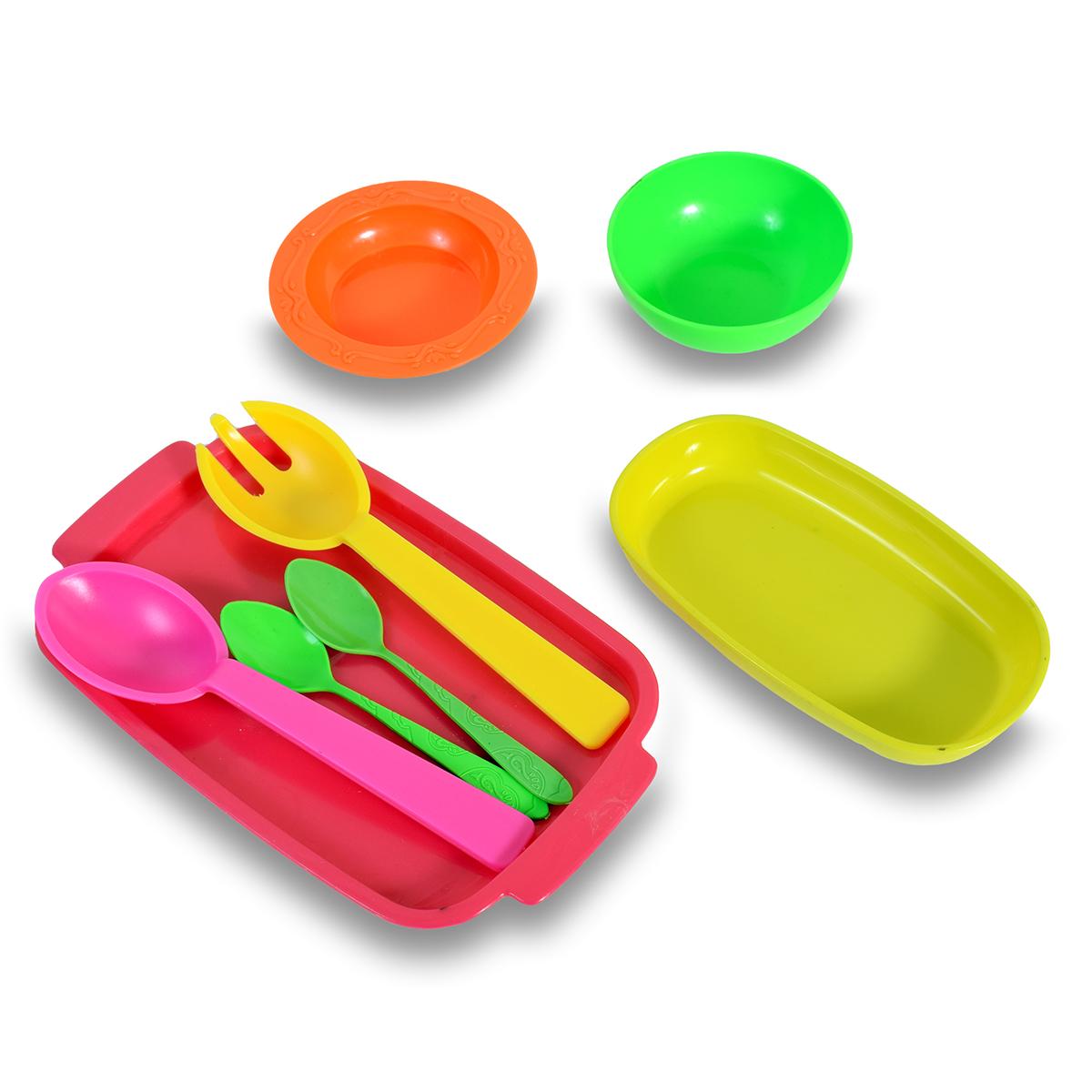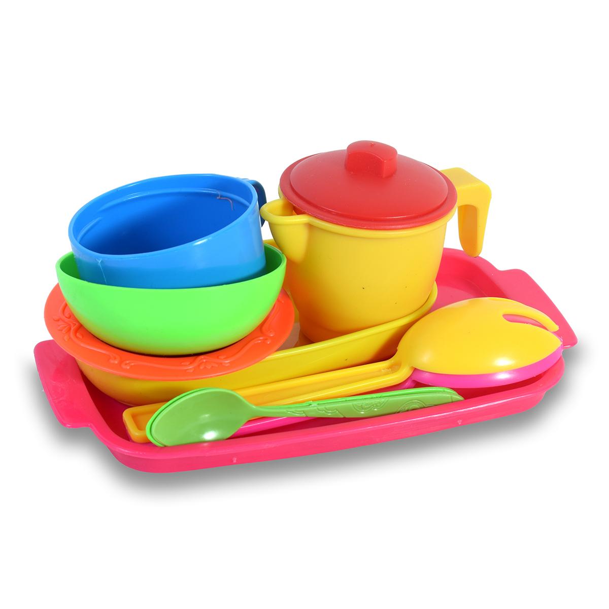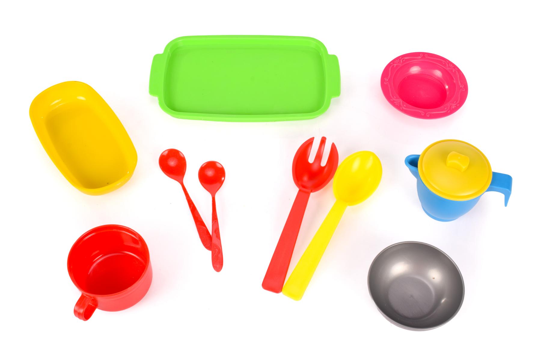 11 разноцветных предметов из безопасного пластика помогут развить воображение и освоить основы ролевых игр. Комплект включает всё необходимое для организации «кукольного чаепития» или «праздничного ужина» в детской комнате.