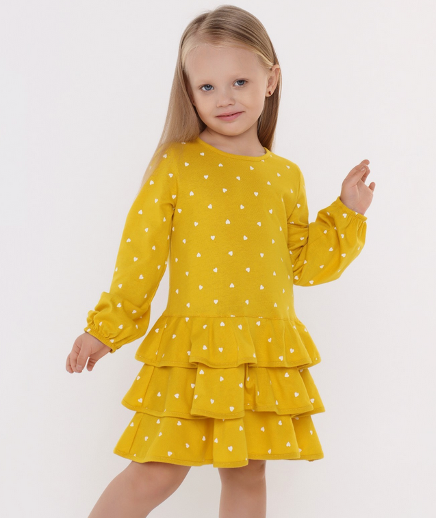 Подарите своей дочке комфорт и стиль с этим очаровательным платьем Luneva! Яркий горчичный цвет с милыми сердечками создаст солнечное настроение в любой день. Платье идеально подойдет для прогулок, детского сада или праздничных мероприятий.