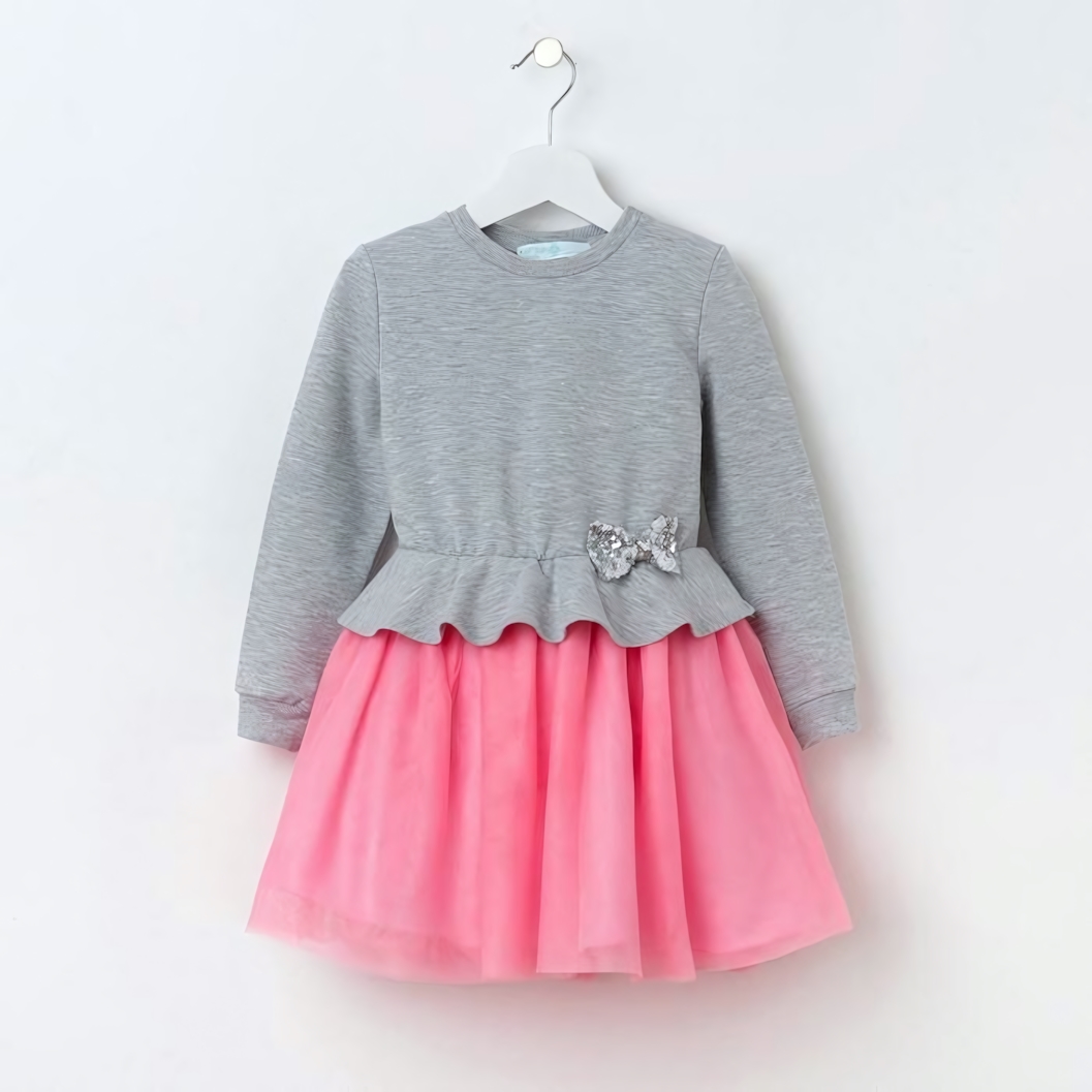 Это платье идеально подойдет для девочек ростом 98-104 см. Верхняя часть выполнена из мягкого серого трикотажа, а юбка – из легкой розовой ткани. Декоративный бант добавляет образу изюминку.