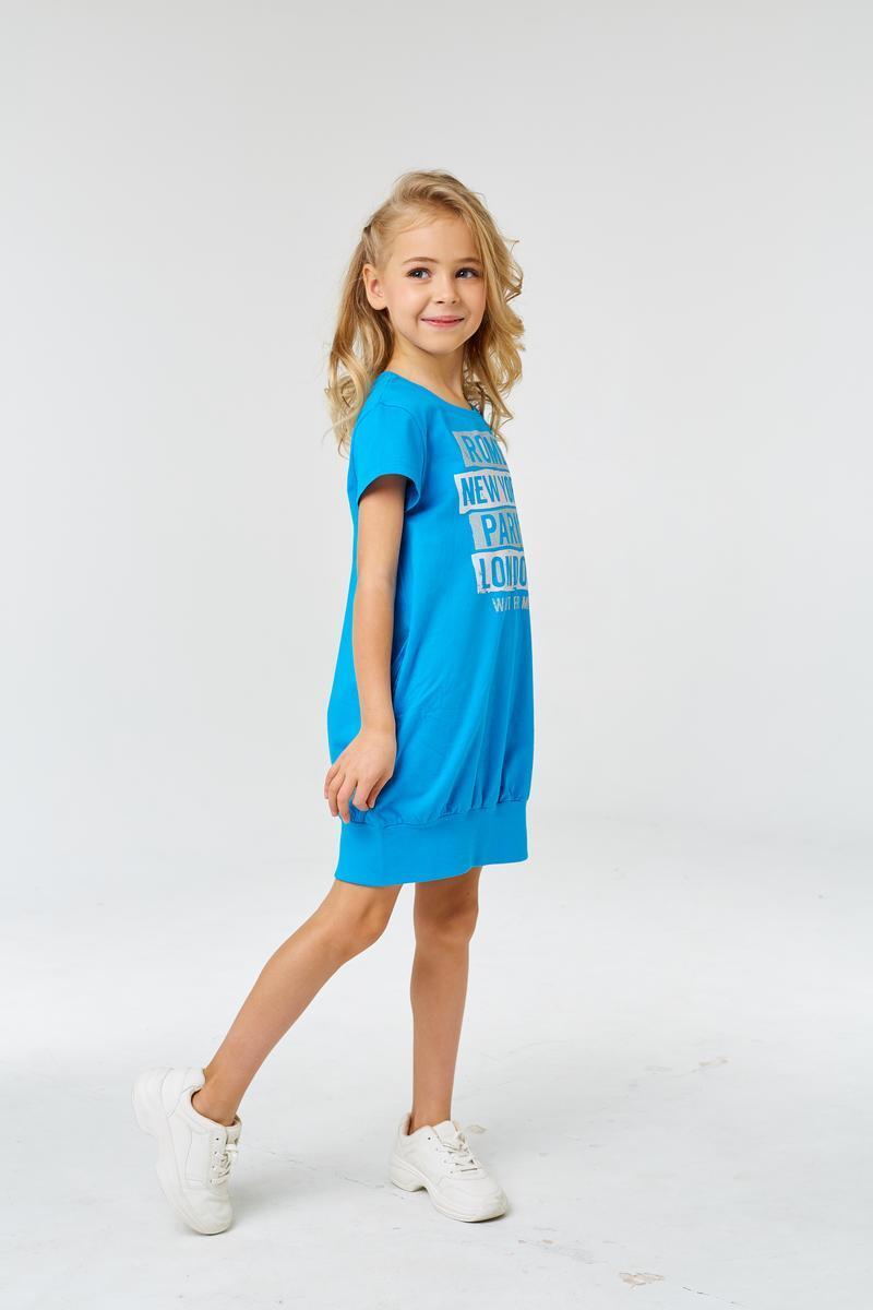 Платье для девочки 110р, голубое, хлопок, с принтом 'ROME', 'PARIS', 'LONDON'