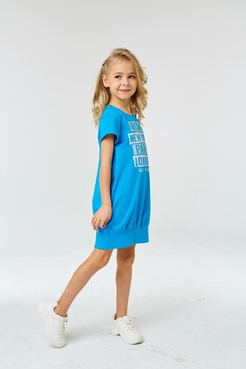 Платье детское голубое с принтом городов, 100% хлопок, размер 122, свободный крой