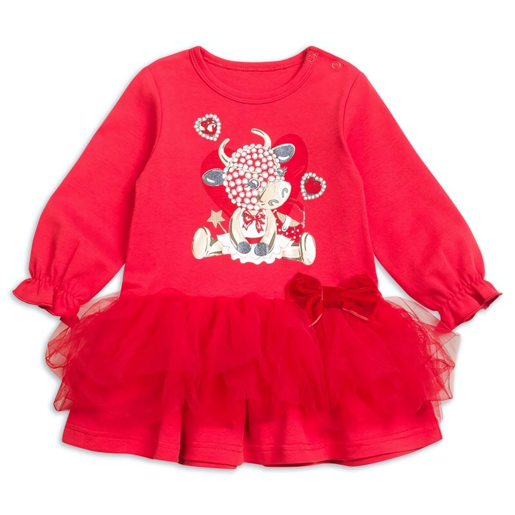 - Оригинальный дизайн: Яркий красный цвет, забавный принт с коровкой и пышная юбка из фатина не оставят равнодушными ни одну маленькую принцессу.