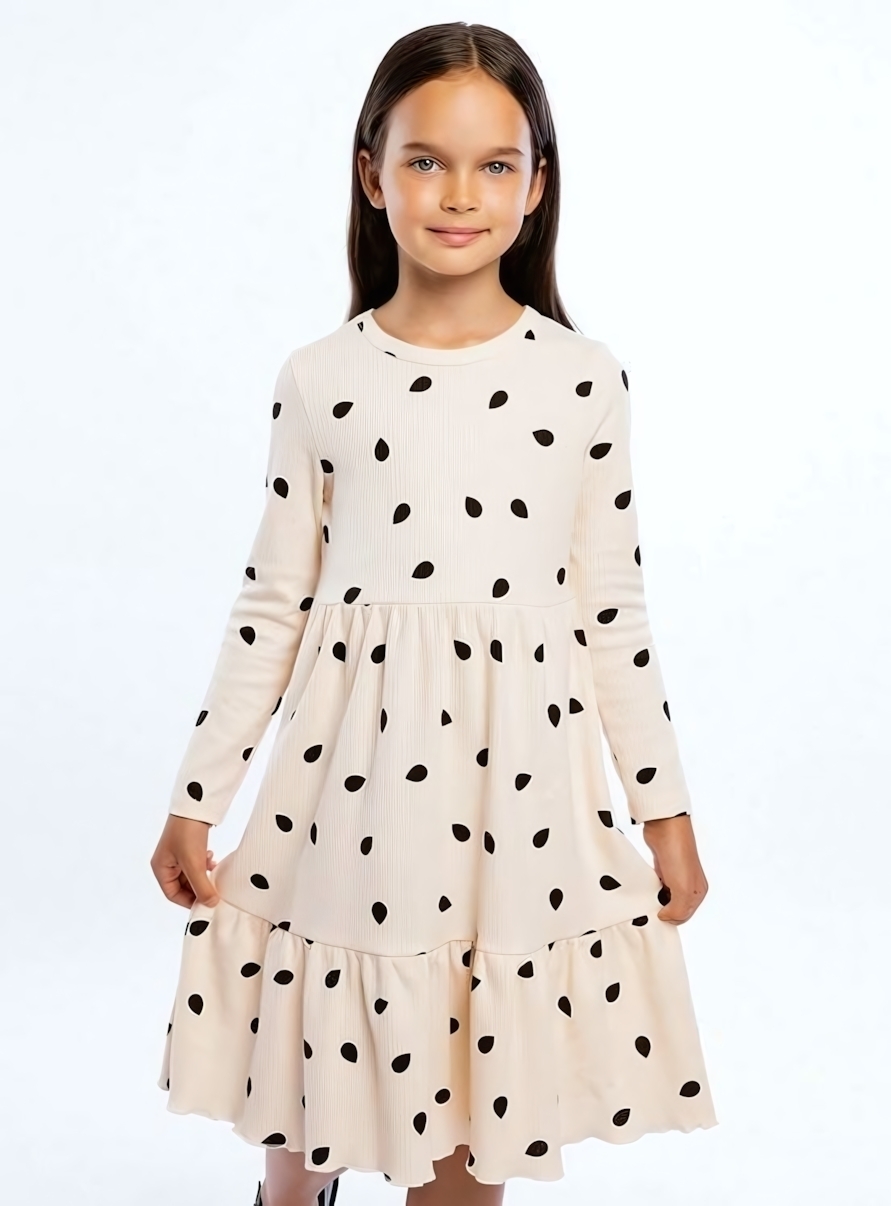 Игристые оборки на подоле добавляют образу динамики, а эластичная ткань сохраняет форму после множества стирок. Сочетание бежевого фона с графичным узором делает наряд универсальным для любых мероприятий — от прогулок до детских праздников.