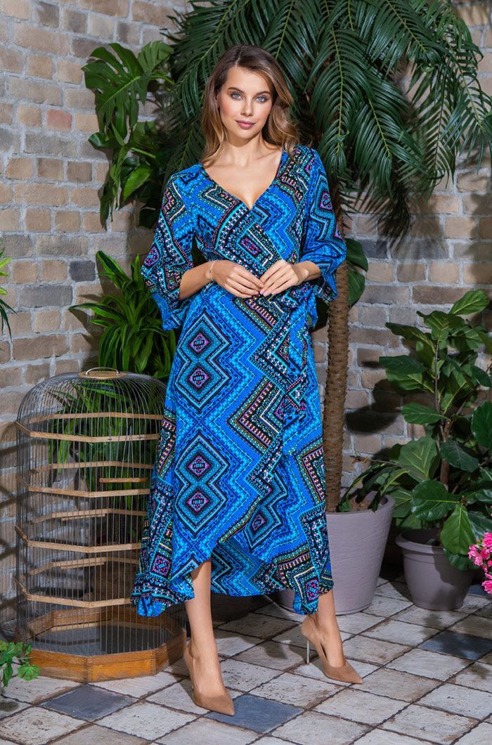 Платье Jana из принтованной вискозы — это идеальный выбор для тех, кто ценит стиль и комфорт. Яркий голубой цвет и оригинальный принт делают его универсальным элементом гардероба, подходящим как для повседневной носки, так и для особых случаев. Благодаря приталенному силуэту на запах, платье подчеркивает фигуру, создавая элегантный и женственный образ.