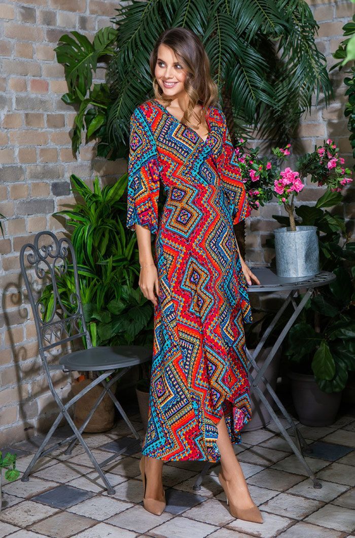 Платье подходит для различных случаев: от прогулок по городу до вечерних выходов. Легкая и струящаяся ткань из 100% вискозы обеспечивает комфорт в теплую погоду, а свободные рукава длиной ¾ добавляют свободы движений. V-образный вырез горловины придает образу изысканность и стиль.