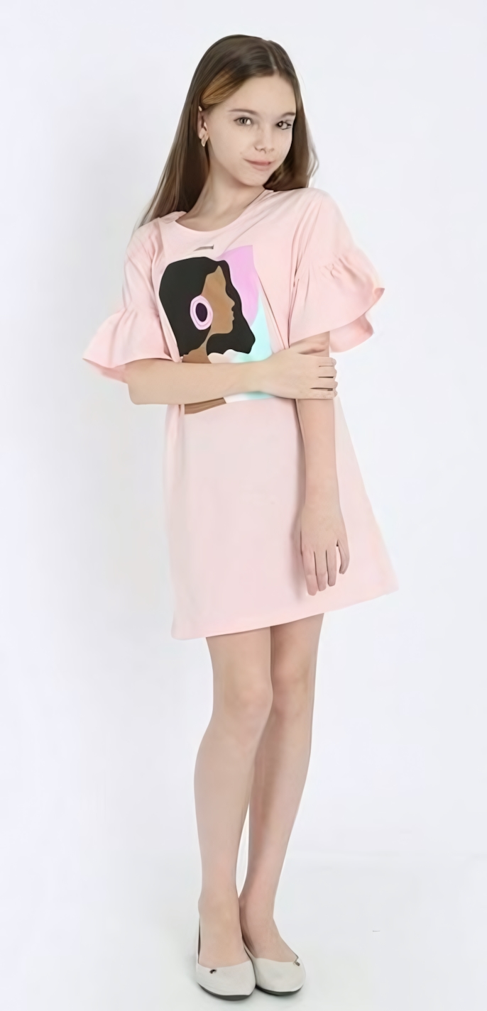 Платье украшено стильным принтом и дополнено волнистыми рукавами, что придает образу игривость и очарование. Ваша девочка будет выглядеть модно и привлекательно в любой ситуации. Благодаря свободному крою, платье отлично подойдет для активных игр и прогулок, не стесняя движений.