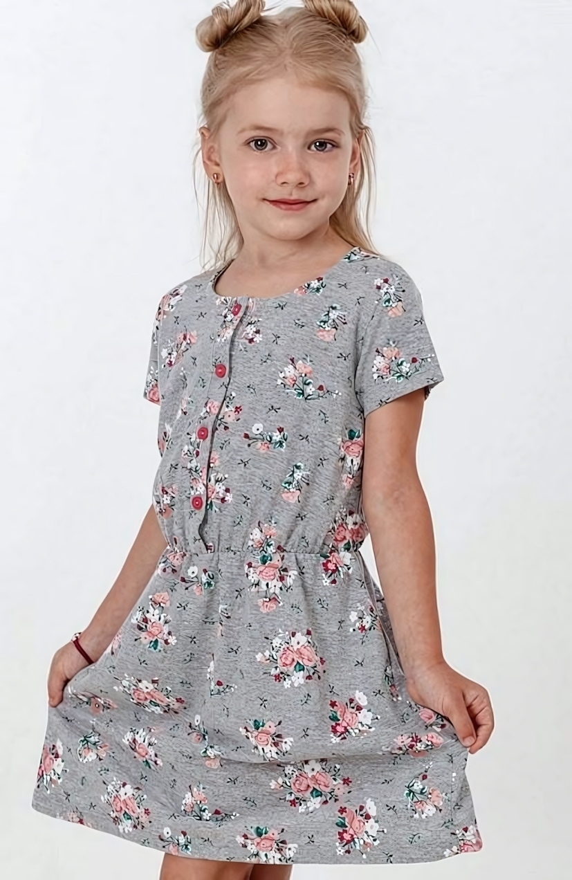 Платье для девочки "Юлла", 100% хлопок, р.104-110, серый с цветочным принтом