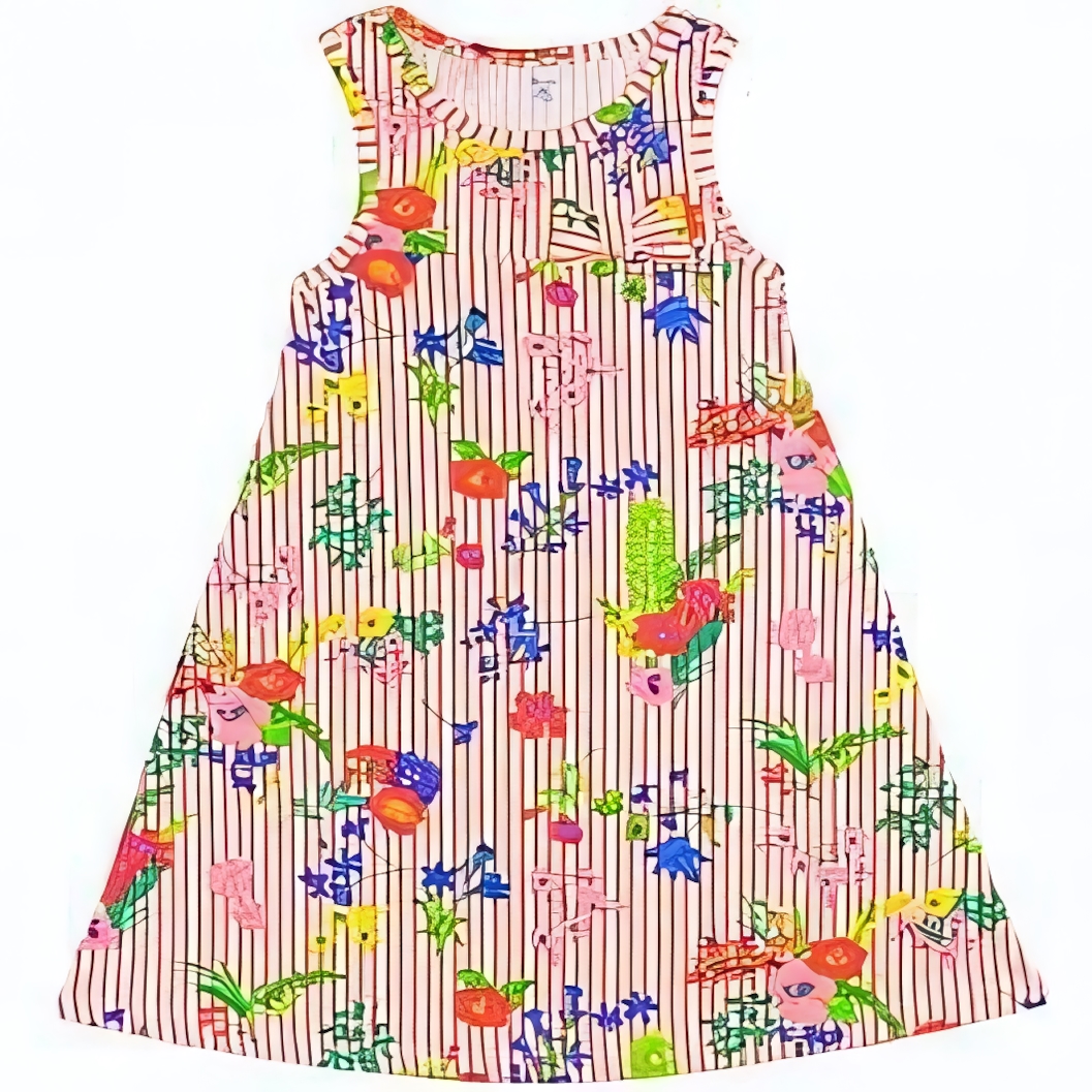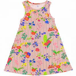 Платье имеет прямой силуэт без рукавов с округлым вырезом горловины. Цветовая гамма сочетает белый фон с красными полосками и цветочными элементами в синем, зеленом, желтом и розовом оттенках.