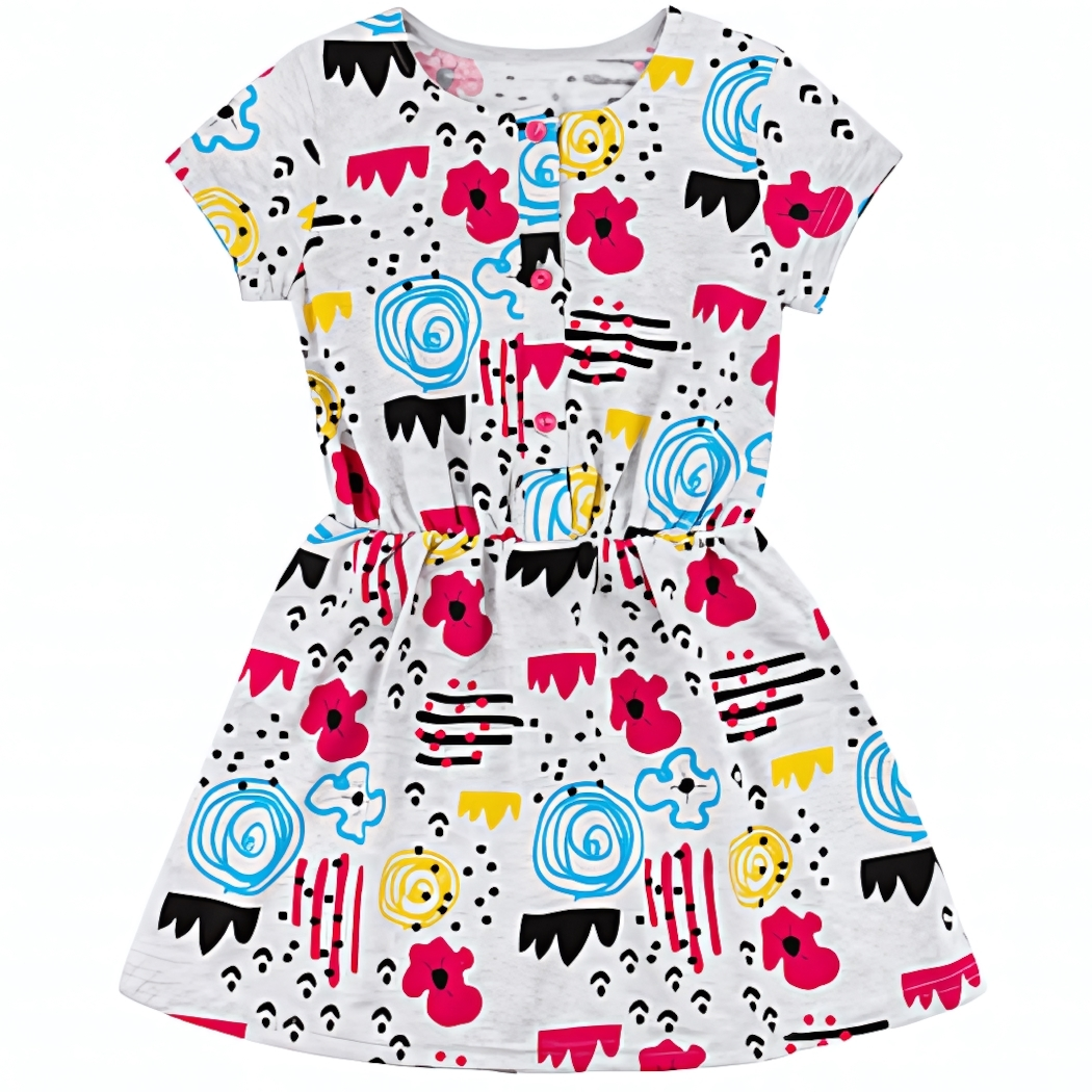 Дизайн платья характеризуется ярким цветным принтом с цветочными и геометрическими формами, который обязательно привлечет внимание окружающих. Резинка на талии создает эффект сборки, подчеркивающий линию талии небольшой модницы. Длина платья подходит для активных игр, обеспечивая детям необходимую свободу движений.