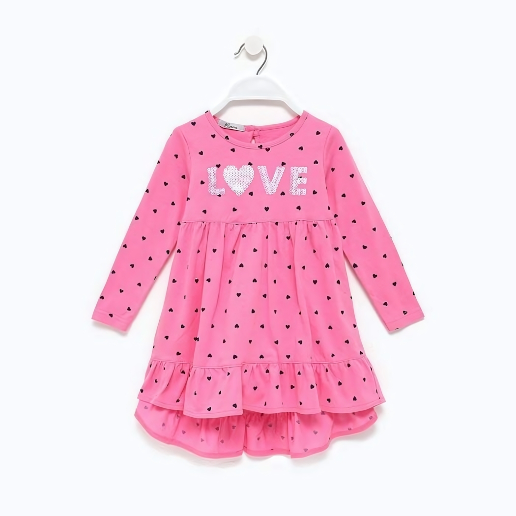 Это платье на кулирке превратит обычный день в маленький праздник: воздушный материал, мягкий розовый оттенок и милый принт из черных сердечек создают ощущение сказки, а надпись LOVE с блестящим сердцем добавляет нотку романтики.