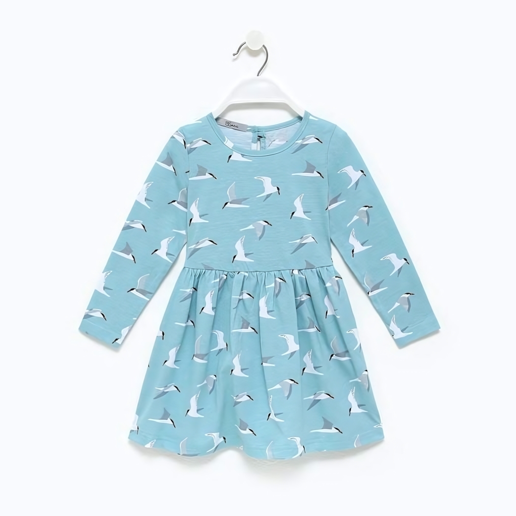 Идеально подходит для девочек от 3 до 8 лет. Длинные рукава защищают от прохлады, а круглый вырез обеспечивает удобство надевания без лишних регулирующих элементов. Плиссированная юбка создаёт романтичный силуэт, а нежный принт летящих птиц добавляет нотку сказочности.