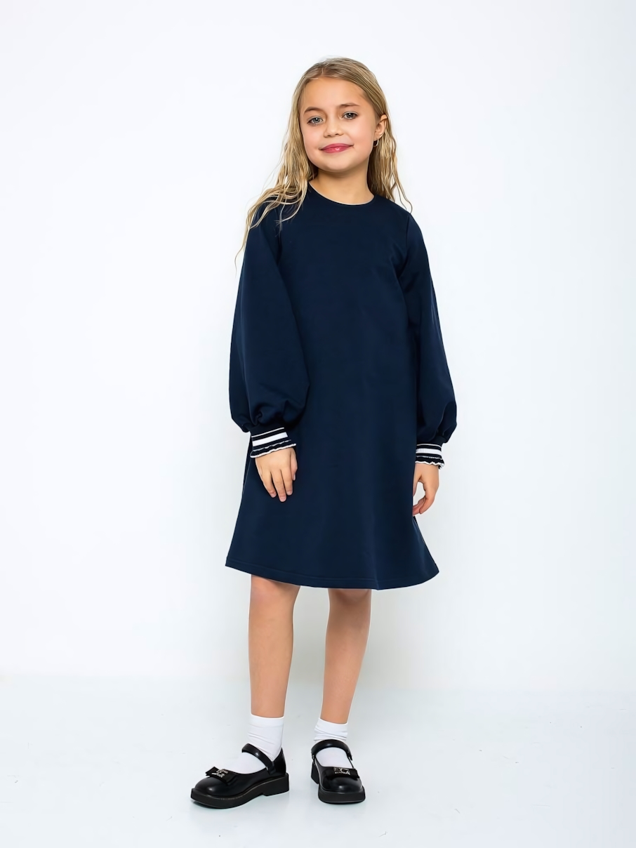 Это платье из однотонного футера А-силуэта обеспечит вашему ребенку комфорт и стиль в любой ситуации. Оно идеально подходит для школьных мероприятий, праздников и повседневной носки. Длинные втачные пышные рукава на манжетах из мягкого подвяза добавляют изысканности, а круглый вырез горловины делает его удобным для ношения.