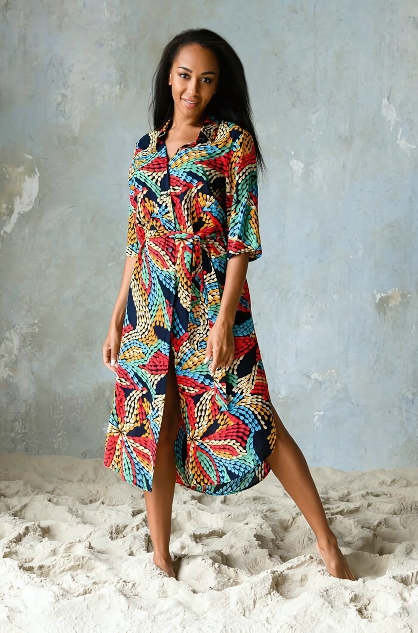 Откройте для себя комфорт и яркий стиль с этим платьем-туникой. Идеальный выбор для летних прогулок, отдыха на пляже или повседневных образов. Модель выполнена из легкой, мягкой и приятной на ощупь вискозы, которая позволяет коже дышать и обеспечивает комфорт в жаркую погоду. Объемный яркий принт с абстрактными линиями и насыщенными цветами делает каждое платье уникальным, подчеркивая индивидуальность и стиль владельца.