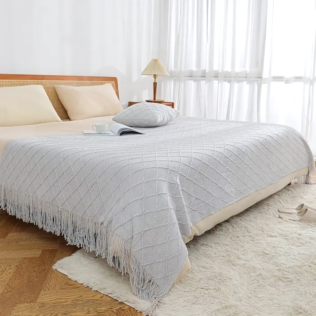 Текстурный рисунок в виде ромбов не только добавляет эстетики, но и создает дополнительный объем, делая плед еще более комфортным.