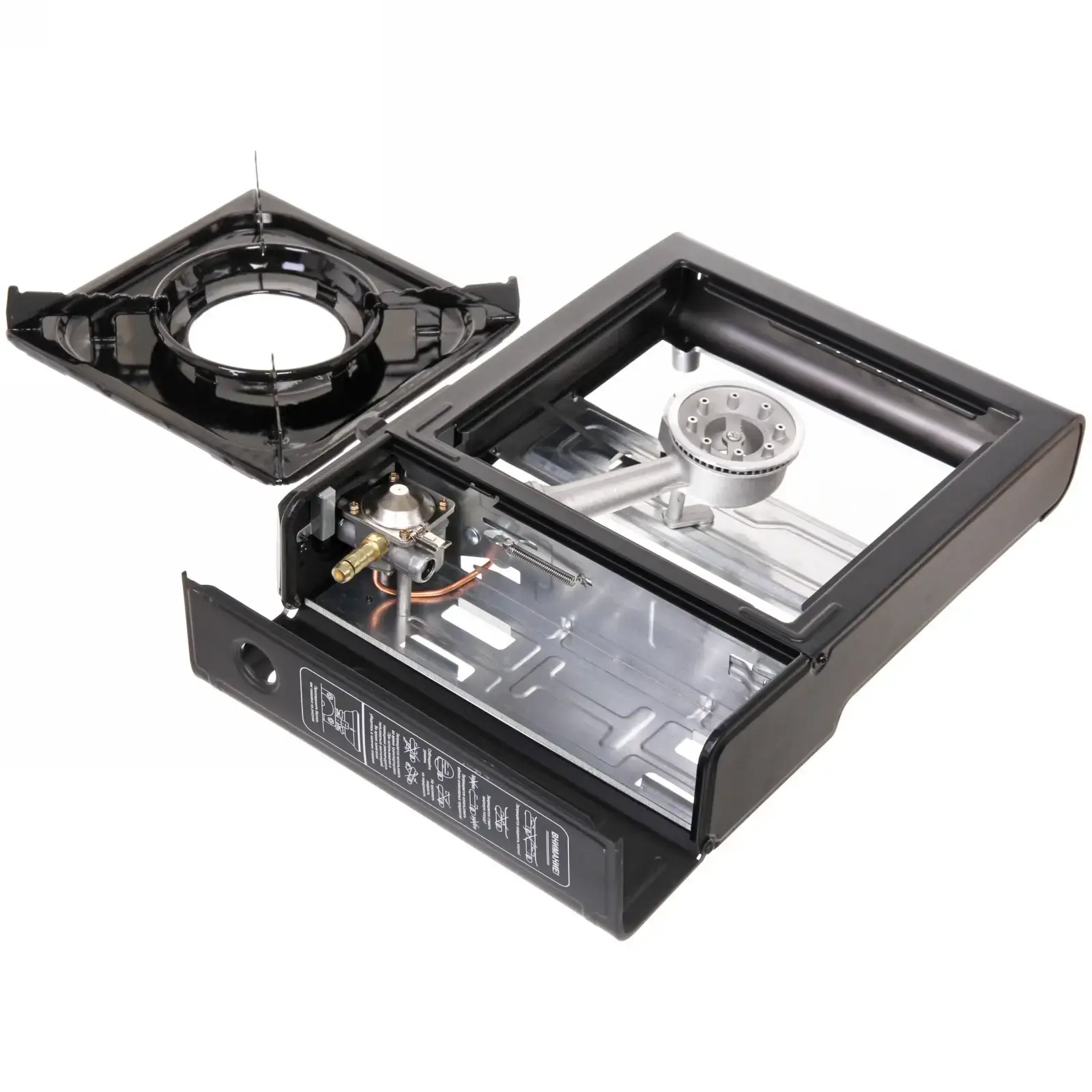 Комплектация включает пластиковый кейс с ручкой для защиты от повреждений при перевозке. Для начала работы достаточно подключить баллон и повернуть регулятор — плита готова к использованию!